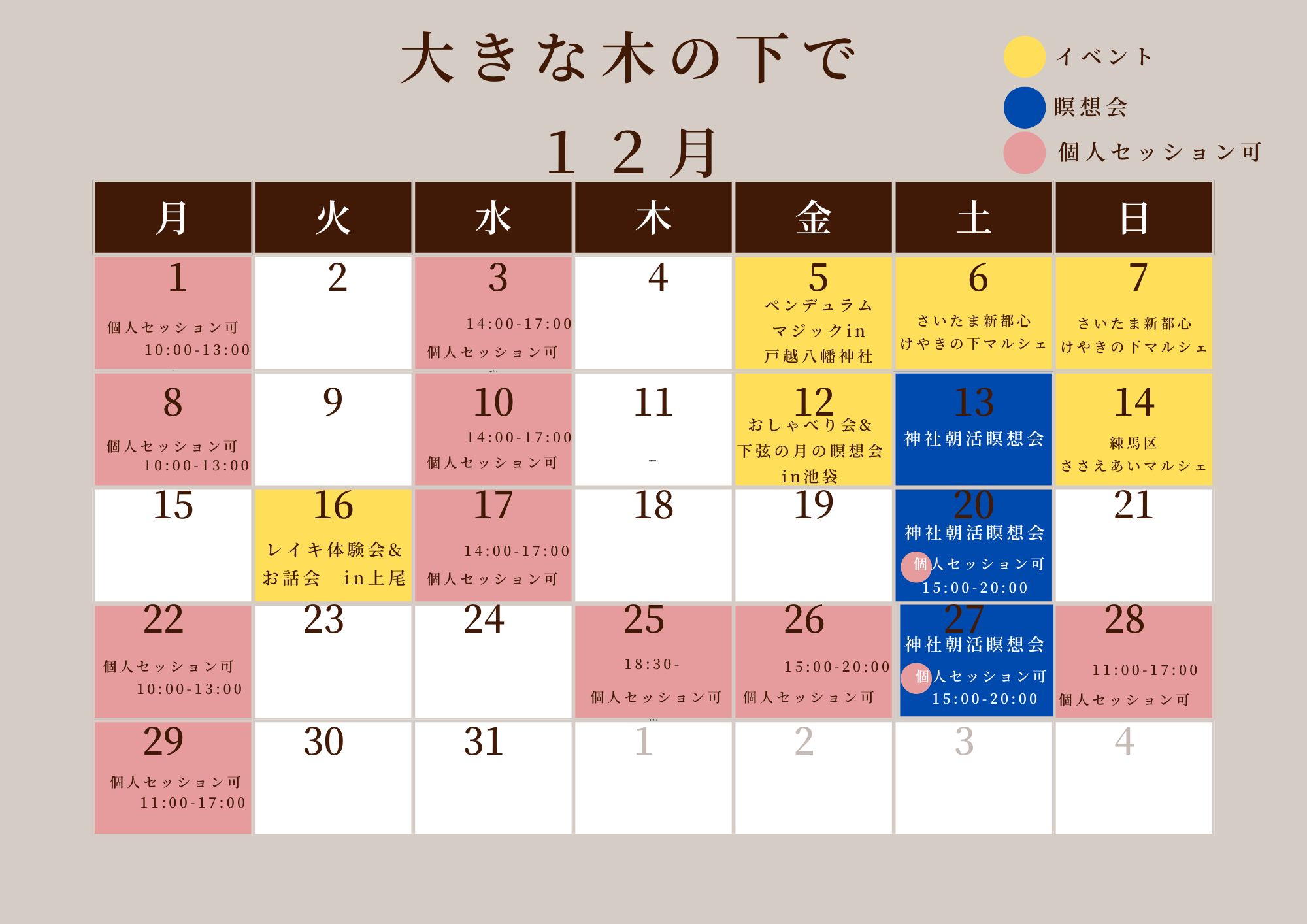 2026年12月のスケジュール イベント 2025.11.242025.11.27 12月のスケジュールアップしました。 それぞれのイベントや瞑想会の詳細は追ってアップしていきます。 公式ラインでは1週間に1回程度、スケジュールやおすすめ情報をお知らせしています。 こちらもご登録お願いします! Add LINE friend